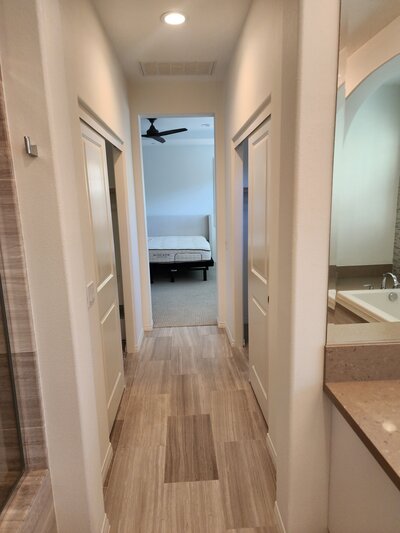 Nestled within the vibrant community of Rancho Mission Viejo, this primary suite remodel was anchored on principles of functionality, timeless design, and an uncluttered aesthetic. Outdated builder-grade finishes were removed to make way for surfaces, materials, and a brand new floorplan that feel fresh yet enduring, avoiding fleeting trends. Storage solutions were thoughtfully integrated throughout the suite, from highly custom open concept closets to clever compartments, ensuring that every item has its place without sacrificing style. Curated lighting fixtures and their placements were the key to breathing life into the once dark space. The result is a uniquely serene and sophisticated retreat that balances modern convenience with a warm, livable elegance, creating a space that serves the way its owners truly live.